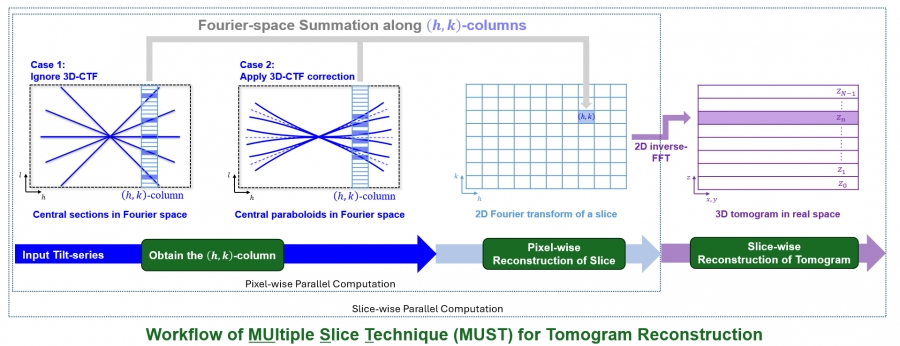 2025年8月10日,清华大学生命科学学院李雪明副教授课题组和清华大学电子工程系沈渊教授课题组联合在“Ultramicroscopy”杂志在线发表研究论文,题目为“基于傅里叶空间的冷冻电子断层成像多层重建方法”(Fourier-based multiple-slice reconstruction in cryo-electron tomography)。论文报道了一种基于傅里叶空间的冷冻电子断层成像三维断层重建方法MUST(MUltiple Slice Technique,图1)。该方法将三维重构密度图看作是由一系列平行平面层(parallel slice,PS)组成的,通过逐层独立计算的方法来合成最后的三维图像。而对于一个平行平面层的计算是通过在傅里叶空间按像素列投影计算得到的。由于像素列的计算是互相独立的,可以实现像素级的并行计算。由此形成实空间平面级并行与傅里叶空间像素级并行的两级并行架构,可大幅提升重建效率。通过对傅里叶空间中频点的相应加权操作,MUST可以获得与基于实空间的WBP和SIRT方法衬度相似的重构结果(图2)。研究团队同时发现,在考虑样品离焦量梯度(defocus gradient)的三维衬度传递函数校正(three-dimensional contrast transfer function correction,3D-CTF correction)中,傅里叶空间中的平面状的中心截面会劈裂为一对中心共轭抛物面(pairs of conjugate central paraboloids,PCCP)。